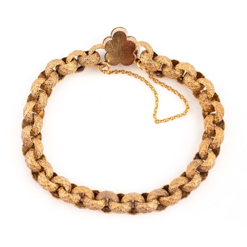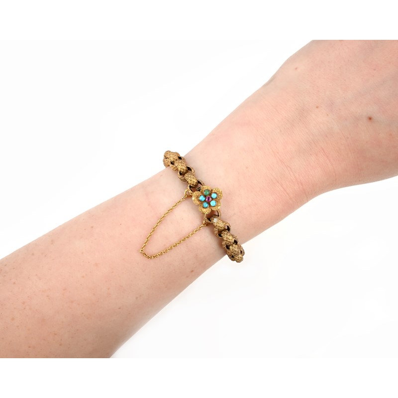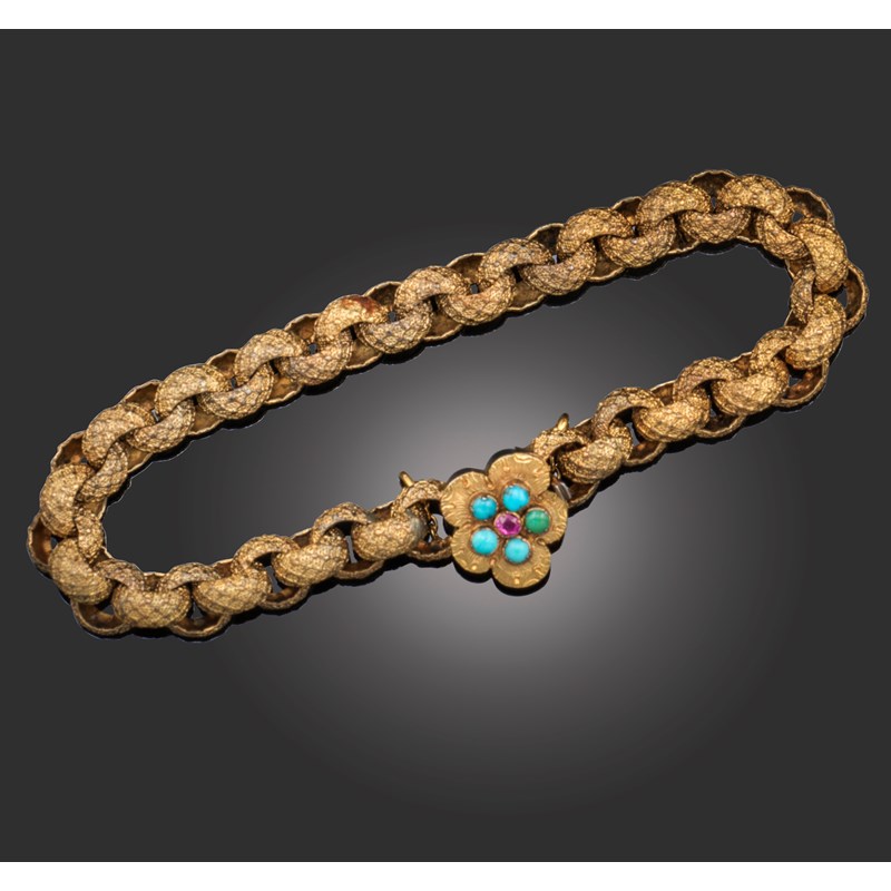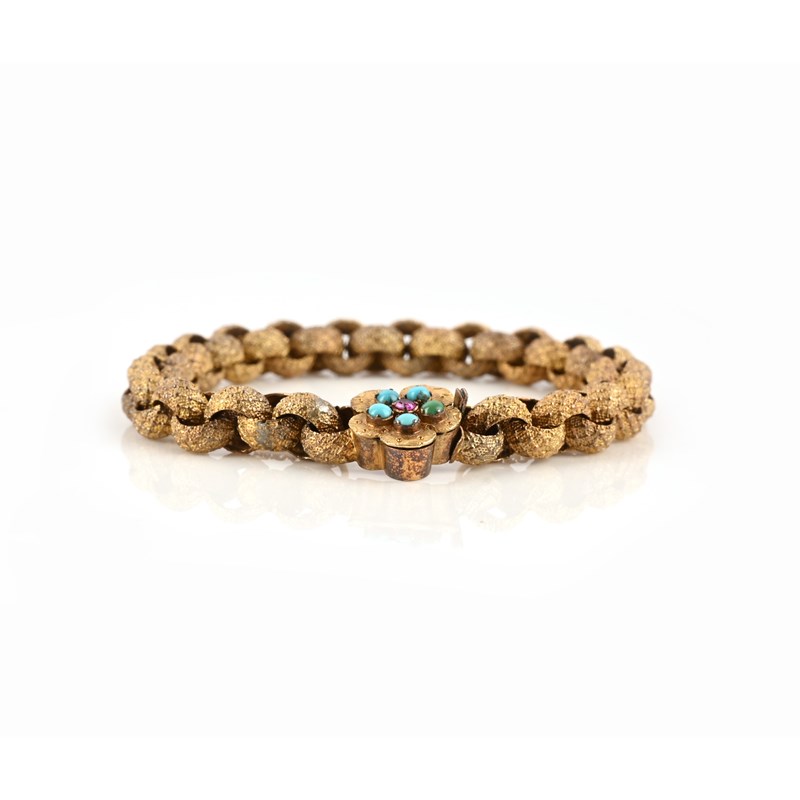A Regency gold bracelet, with textured circular links and a turquoise and ruby-set floral clasp, gross weight 12g, length 16cm