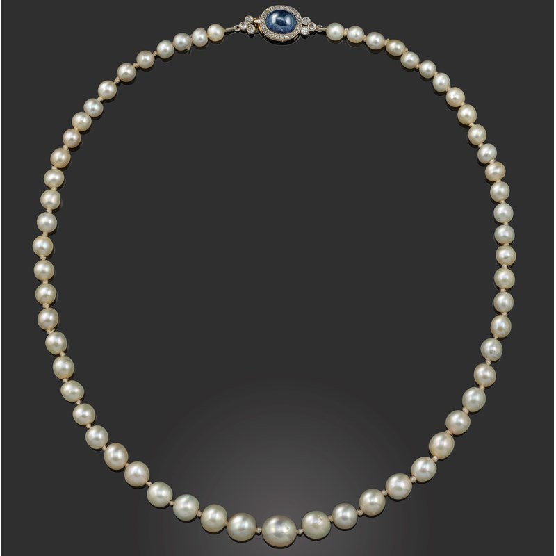 A natural pearl necklace, early 20th century, designed as a single strand of graduated natural pearls measuring approximately 4.75-9.21mm diameter, to a clasp set with a cabochon sapphire bordered by rose-cut diamonds, length 40cm