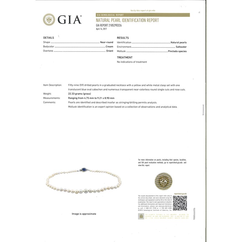 Accompanied by GIA report number 2185290326 dated 14th April 2017 stating that the 59 pearls are natural saltwater, weighing 22.33g (gross) and measuring 4.75-9.21 x 8.90mm.