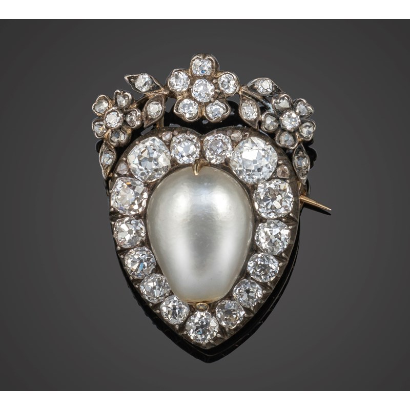 A Victorian natural pearl and diamond brooch, late 19th century, of heart-shaped design, centred with a drop-shaped pearl framed by graduated cushion-cut diamonds below a floral spray set with old circular-cut and rose-cut diamonds, in silver and gold, length 3.1cm