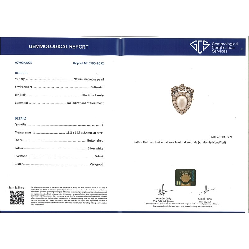 Accompanied by GCS report number 5785-1632 dated 7th March 2025 stating that the pearl is natural saltwater.