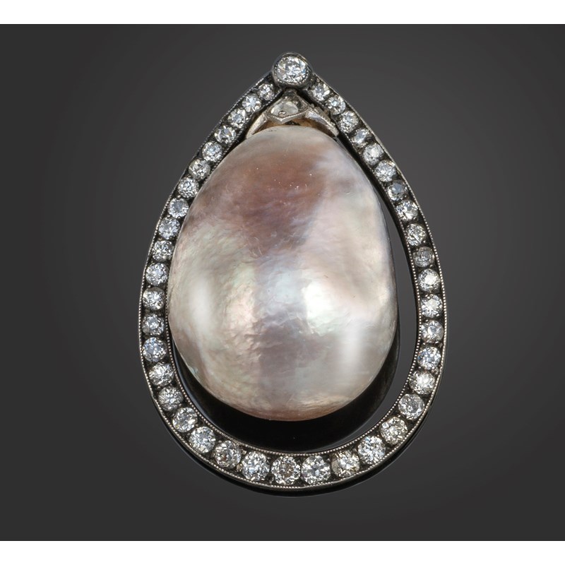 An early 20th century blister pearl and diamond pendant, the pearl suspended within a drop-shaped frame set with graduated old-cut diamonds millegrain-set in silver and gold, length 3.4cm, missing bail