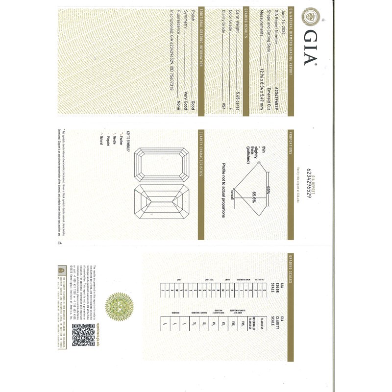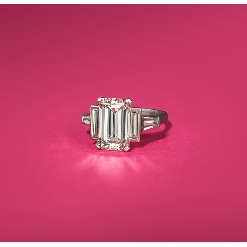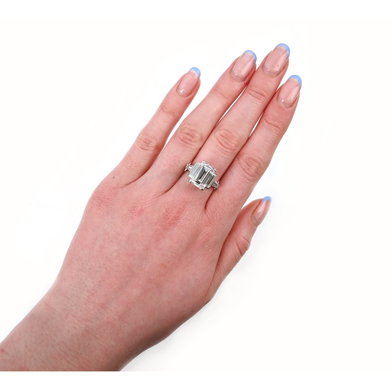 Accompanied by GIA report number 6234296529 dated June 14th 2024 stating that the central emerald-cut diamond weighs 5.65cts, has F colour, VS1 clarity and no fluorescence, with lasered GIA inscription number to the girdle: 75607318