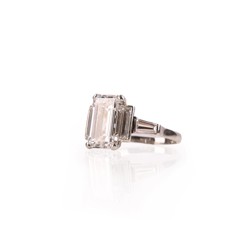 An impressive diamond ring, set with an emerald-cut diamond weighing 5.65cts within baguette shaped and two tapered baguette shaped shoulders in platinum, size P 1/2