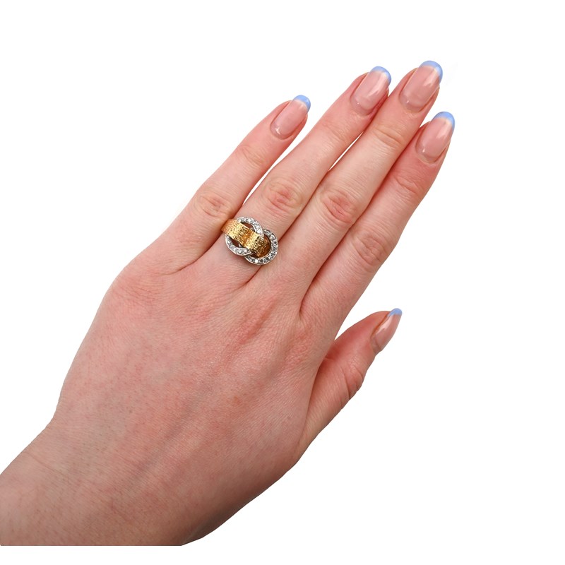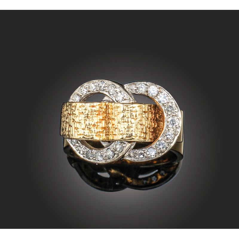Ben Rosenfeld, a diamond ring, 1971, of buckle design, the two white gold disk set with graduating round brilliant-cut diamonds and tied by textured 18ct yellow gold straps to a wide shank, signed BRLd, London hallmarks, date letter for 1971, size approx L