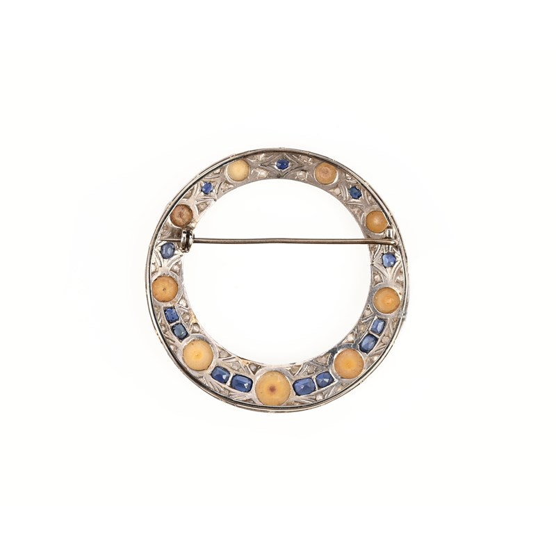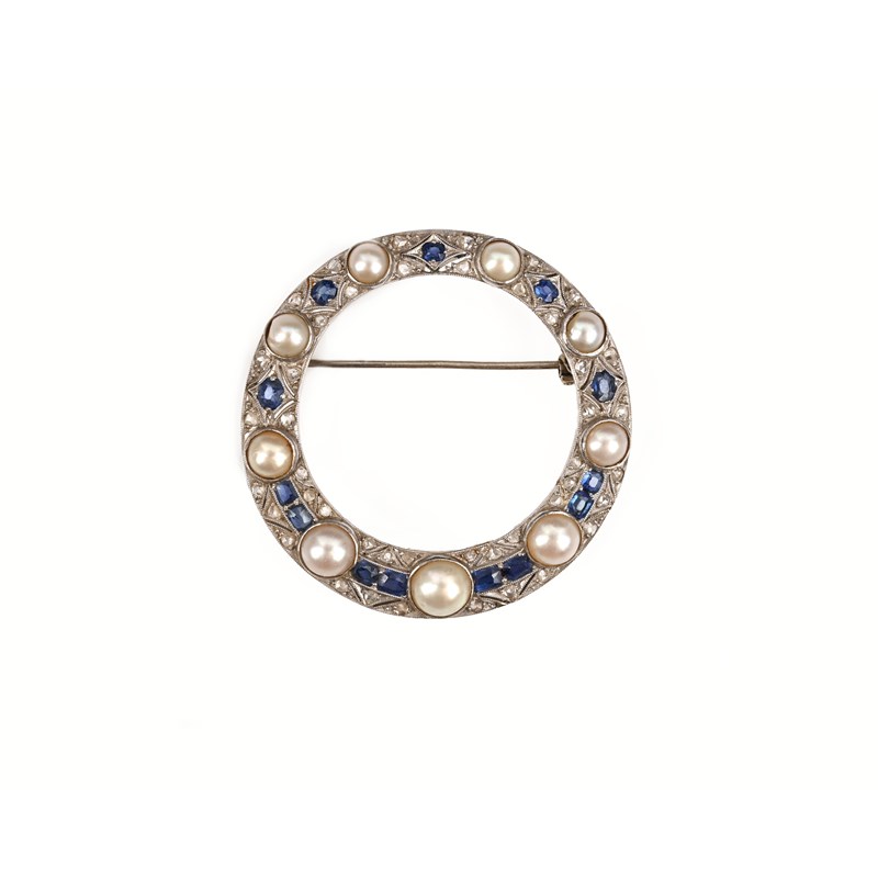 An Art Deco cultured pearl, sapphire and diamond brooch, the graduated half-pearls set in a tapering circular frame decorated with an openwork geometric pattern set with rose-cut diamonds and cushion-cut sapphires in platinum, diameter 4.5cm
