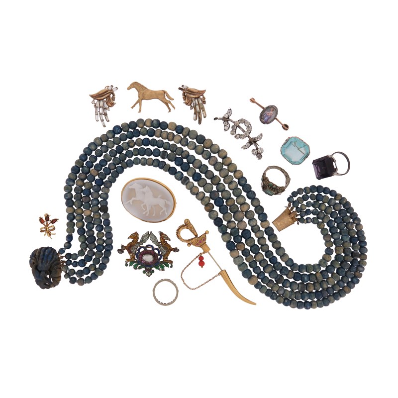 A 9ct gold horse brooch, a 19th century enamel female figure brooch in diamond surround, and eleven items of costume jewellery