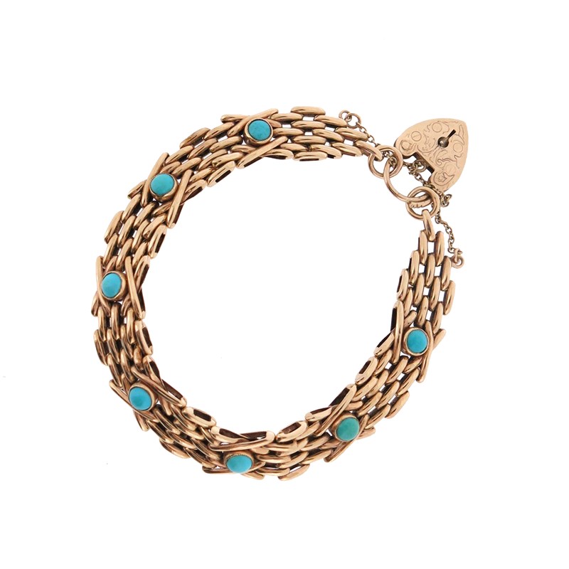 A 9ct gold gate-link bracelet, mounted with circular turquoise cabochons and with 9ct gold padlock clasp, 20cm, approximately 21g