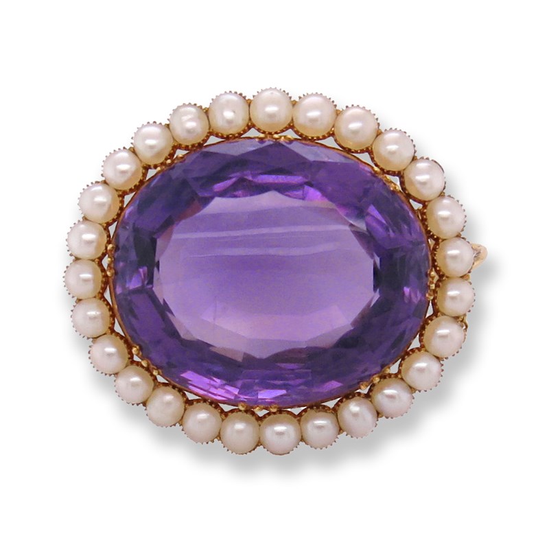 An early 20th century amethyst and half seed pearl cluster brooch, the oval-shaped amethyst with semi cabochon table is set within a surround of seed pearls in gold, 3.1cm wide