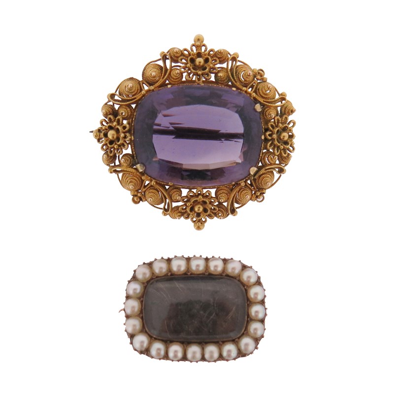 A Victorian gold cannetille framed cushion-shaped amethyst brooch, 3.5cm wide and an early 19th century gold brooch centred with a glazed locket containing plaited hair within a seed pearl surround, engraved with initials to reverse