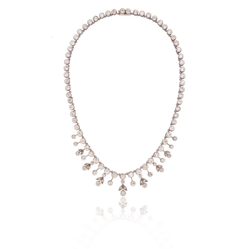 A 19th century colourless paste fringe necklace, the front section of the graduated riviére suspending a graduated floral and foliate fringe, mounted in silver and gold, 40cm, fitted case