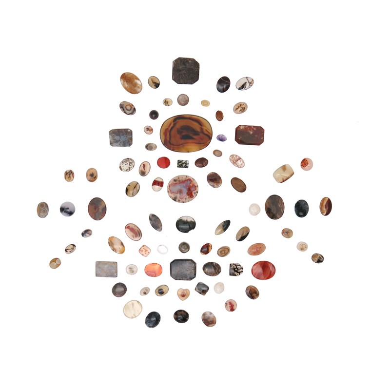 Three cased sets of dendritic and banded agate specimen stones, in three fitted hinged cases containing seventeen, thirty-one (including an additional white cabochon stone) and thirty specimen stones