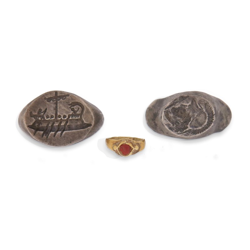 Two silver intaglio rings, one depicting a galleon ship, approximately size K, the other the profile of Ares, approximately size Q, with a small Roman gold child's ring set with a jasper cabochon