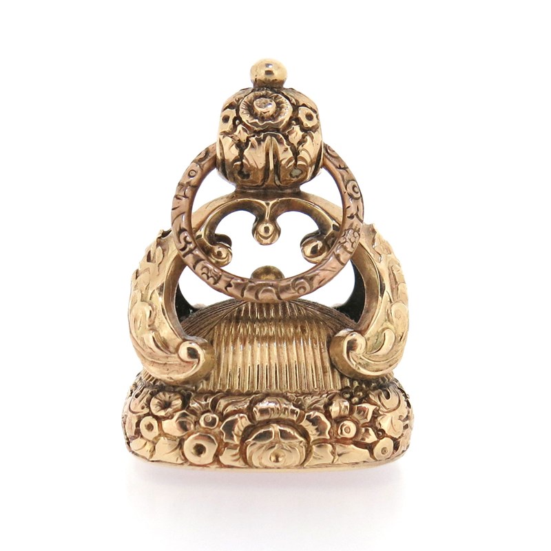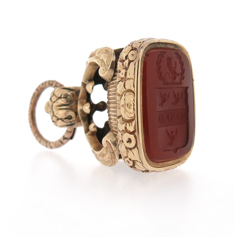 An early 19th century gilt metal stirrup-form fob seal, foliate scroll decoration with conforming split ring, the cornelian matrix carved with arms and a crest for Salathiell George of Trenmouth, Cornwall, within laurel wreath, 4cm high