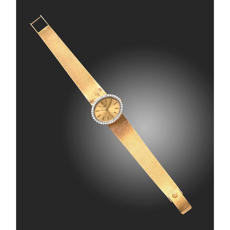 A lady's 18ct gold and diamond wristwatch by Patek Philippe, the signed oval dial with diamond-set bezel on integrated gold bracelet, manual movement, London import marks for 1969, case 24mm wide, 17cm long