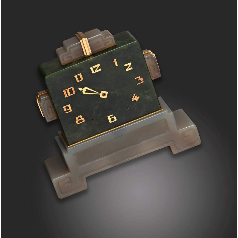 An Art Deco jade desk clock by Tiffany, in the chinoiserie architectural manner, with gold numerals and hand (two numerals and one hand missing) on a raised carved nephrite jade and agate plinth with smaller gold-mounted agate sections to the top and sides, signed to the reverse 'Tiffany & Co, France Sterling', French control marks to the gold mounts, 9.5cm high