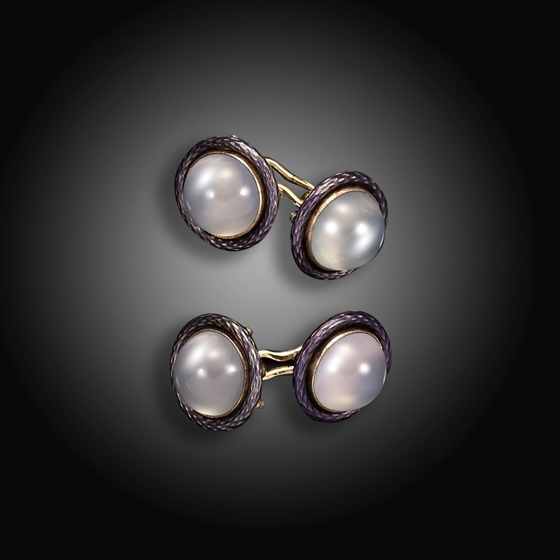 Fabergé - A pair of moonstone, enamel and gold cufflinks, each link centred with a cabochon moonstone within a mauve guilloche enamel border, each link with work master's initials (some indistinct) for August Hollming, the links 1.3cm wide, fitted case by Bentley & Co
