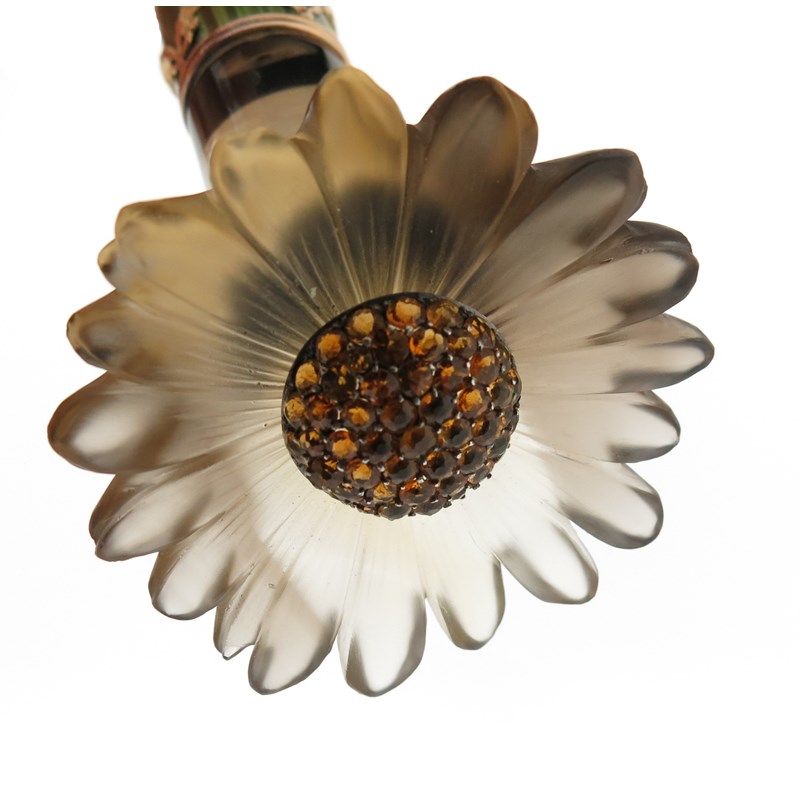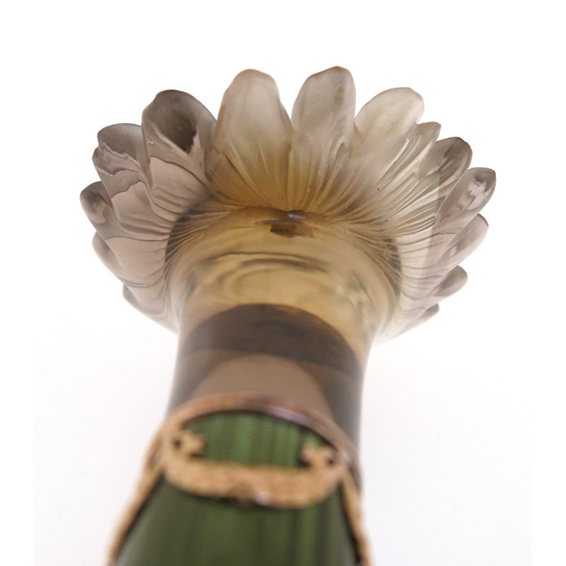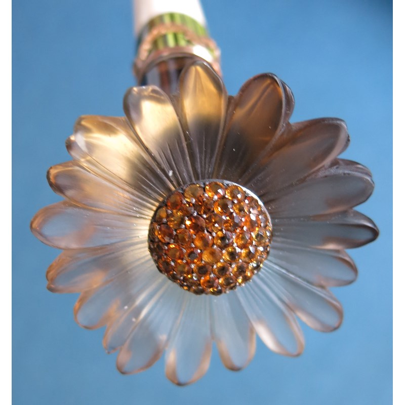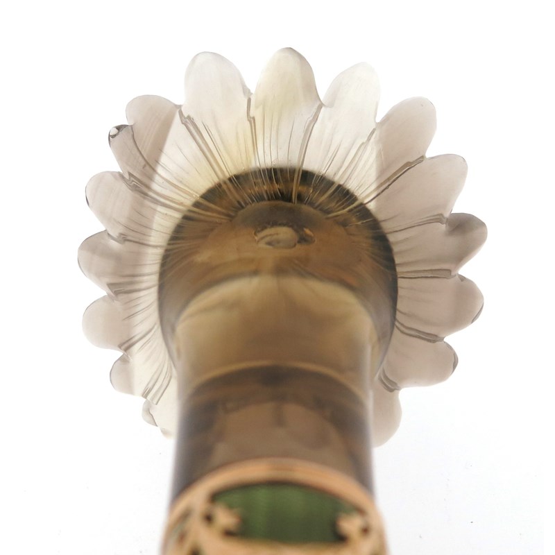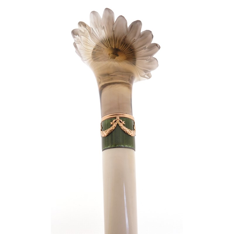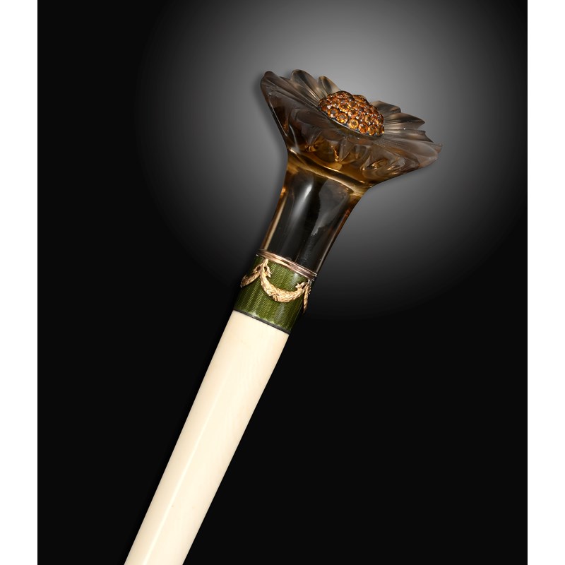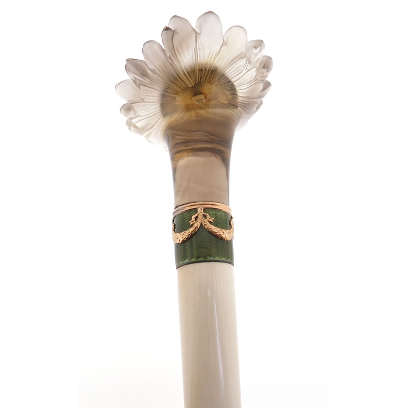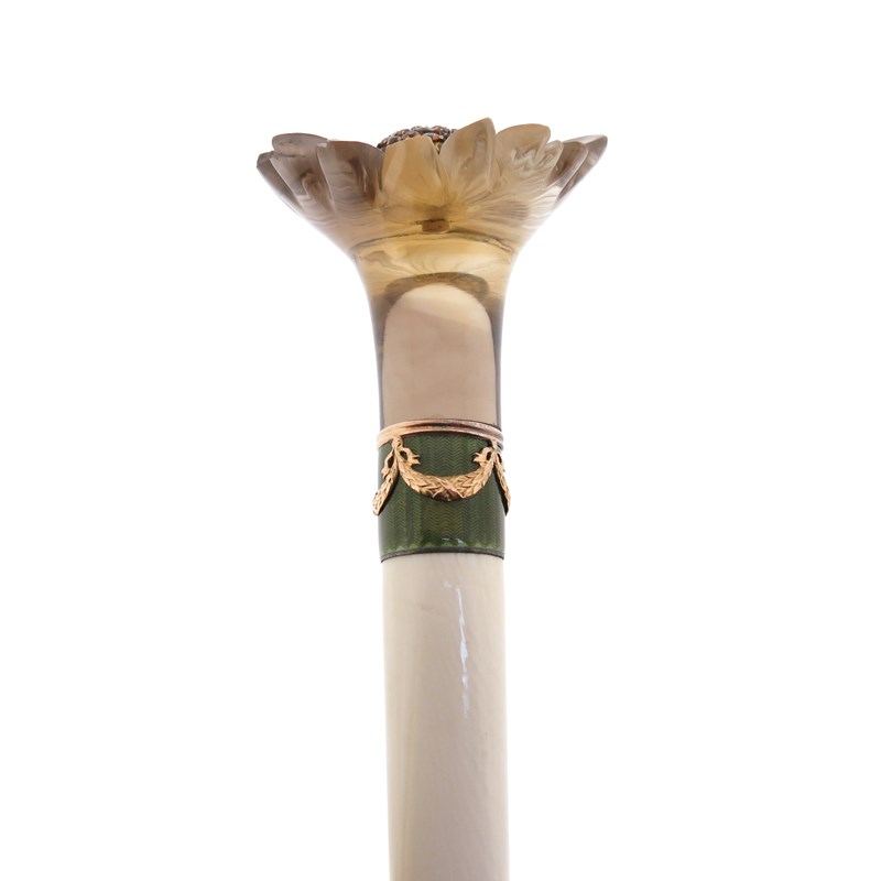 ‡ An ivory baton with carved smoky quartz engraved foliate handle, (probably Russian, early 20th century), centred with a domed circular cluster of gold and topaz, joined to a tapered ivory baton with an olive-green guilloche enamel band with gold swags, the flowerhead 5.3cm wide, 38.5cm long, in fitted hollywood case stamped with Imperial double-headed eagle to the silk lining