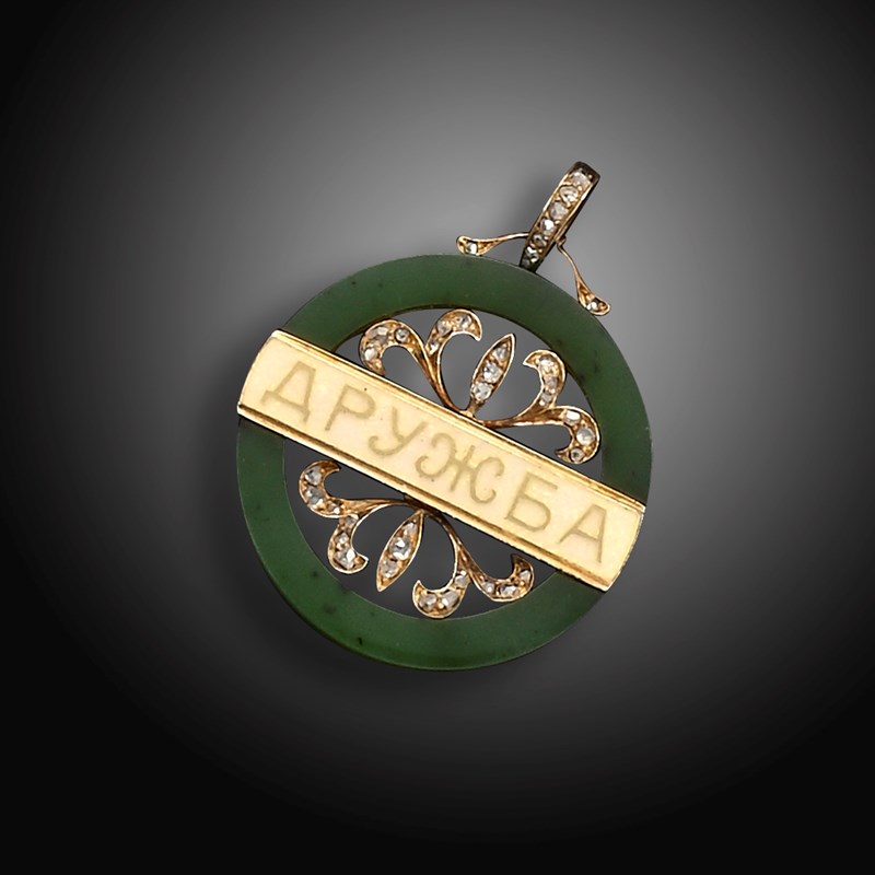 Fabergé - a circular nephrite pendant, centred with a rose-cut diamond-set scroll design in gold and applied with an enamel bar spelling Äðóæáà (Friendship), signed to the reverse KÔ and inventory number 2437 with further KÔ with 56 zolotnik to the border, 2.1cm wide, associated fitted box