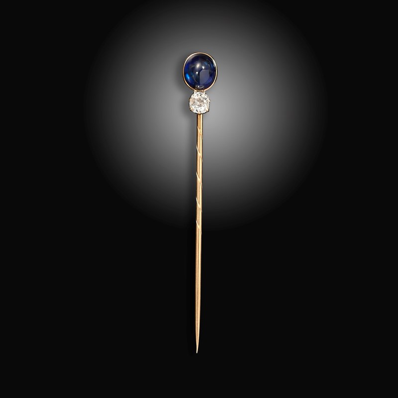 A sapphire and diamond stickpin, the oval cabochon sapphire is set with an old circular-cut diamond in gold, indistinct marks, (possibly Russian), 6.7cm long
