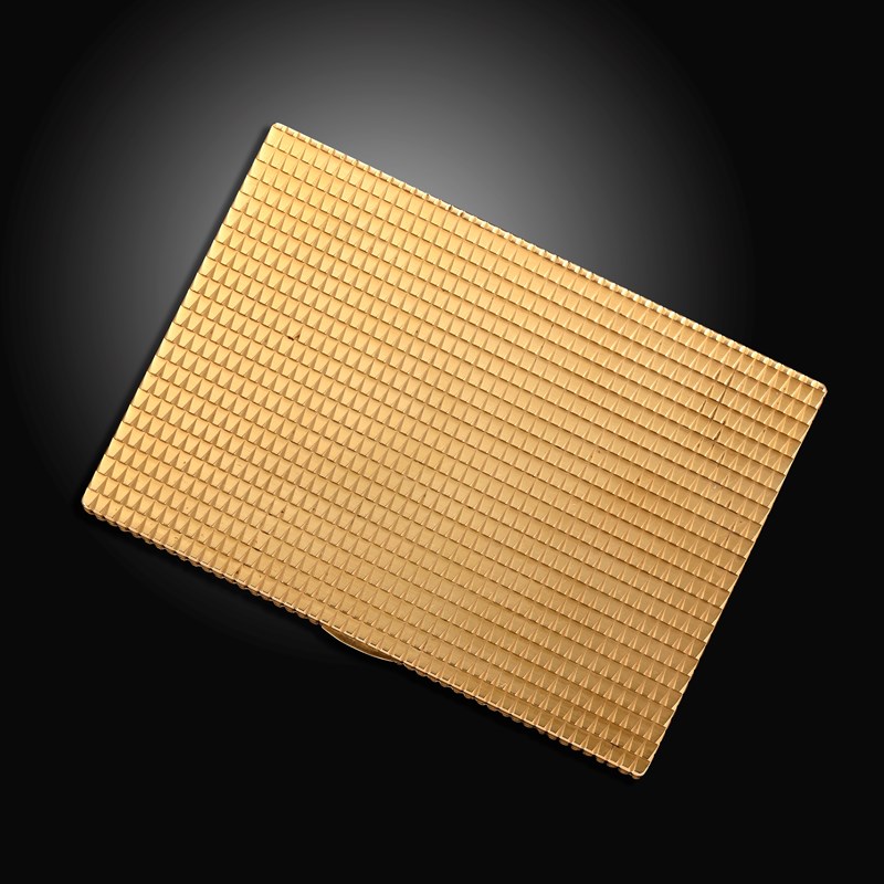 An 18ct gold rectangular cigarette case by Cartier, with unusual engine-turned pattern overall, sapphire-set raised thumbpiece, spring-loaded opening, London marks for 1938, marked JC and signed Cartier London, 11.7cm wide, 270g total weight, fitted Cartier red leather box embossed B.J.S.