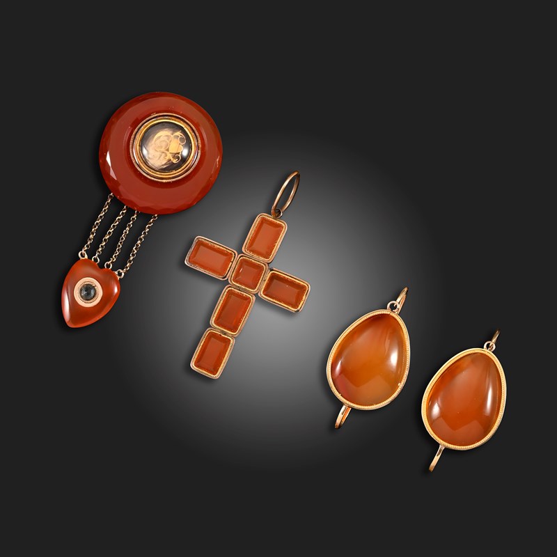 Three items of 19th century carnelian-mounted jewellery, including a 19th century cornelian and gold pendant brooch, the faceted circular plaque containing a glazed heart motif and suspending a heart-shaped cornelian on three gold chains, together with a pair of 19th century gold-mounted cornelian earrings and a cornelian-mounted gold cruciform pendant, 3.5cm