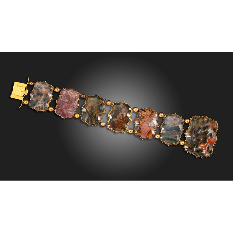 A 19th century agate plaque bracelet, each dendritic agate plaque is mounted in gold, 19cm