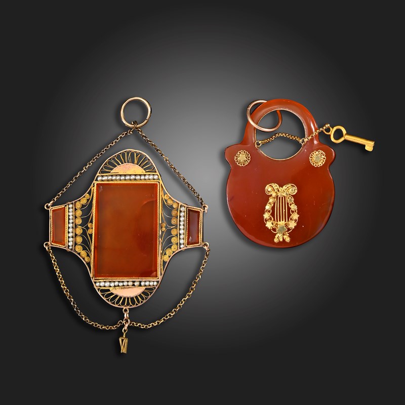 An early 19th century carnelian padlock pendant, with gold filigree decoration depicting a lyre and key, 4.4cm wide, with an early 19th century carnelian, seed pearl and filigree pendant, set in gold, 4.7cm wide