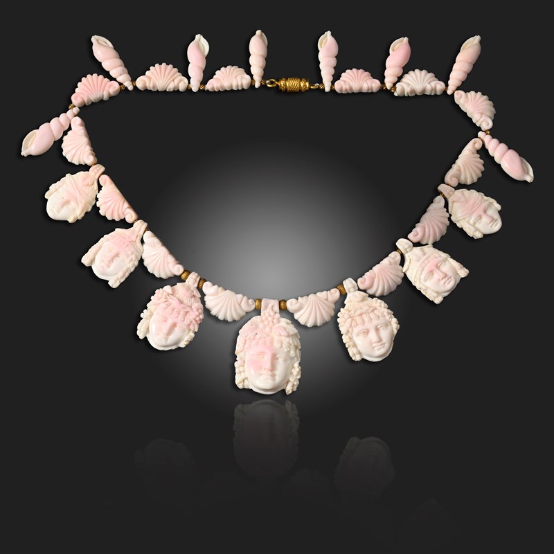 A Victorian carved conch shell necklace, set with seven graduated carved faces spaced with carved coral shells, 40cm long