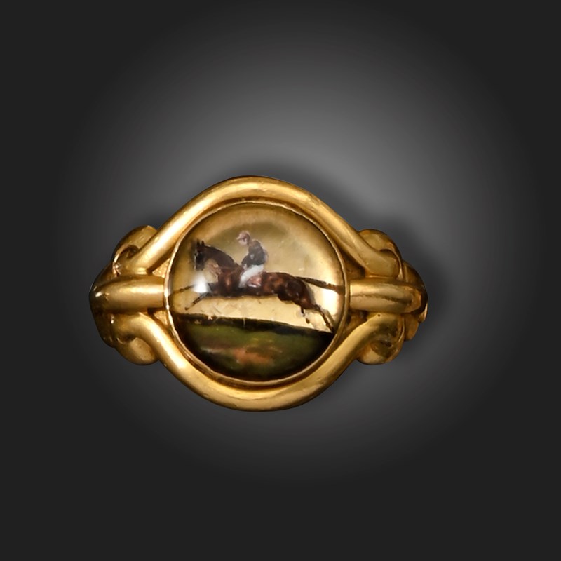 A Victorian reverse carved crystal ring, depicting a leaping horse and jockey within twisted yellow gold mount, size P ½