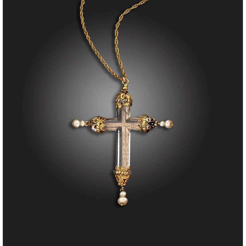 A 17th century style rock crystal and enamel cross pendant brooch, the rock crystal bevelled Latin cross with ornate black and white enamel terminals suspending pearls (damaged), later fancy link chain necklace, pendant 6cm