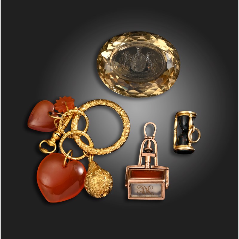 An early 19th century carnelian and gold cased pendant on a split ring, the ornately engraved split ring suspending two carnelian heart-shaped pendants and a rotating carved carnelian pendant, together with a watch key, an ornately engraved gold cased pear-shaped pendant with a glazed compartment containing plaited hair, together with a mid 19th century swivel seal set with three rectangular hardstone plaques, a bloodstone and gold-cased 'hourglass' pendant, and an unmounted oval mixed-cut citrine, centrally intaglio engraved with a heraldic crest