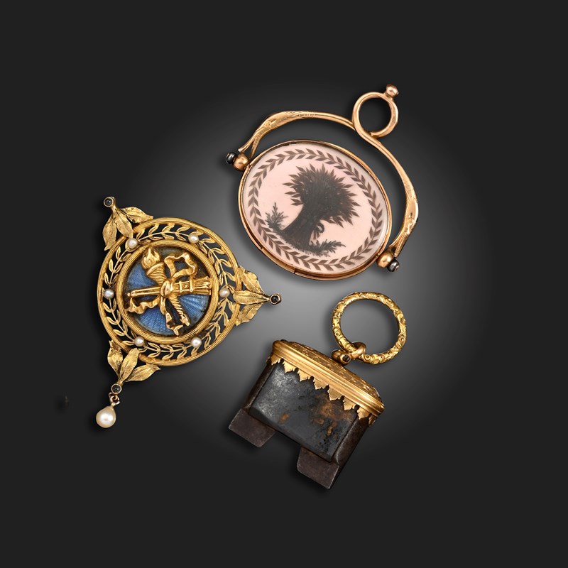 Three items of 19th century jewellery, including a French gold oval swivel pendant, the central glazed locket compartment containing a hair wheatsheaf constructed of hair, the surmount formed with serpents, 4cm widest, together with a yellow gold, enamel and seed pearl brooch, a trophy of two flaring torches applied to the guilloche enamel centre, within a border of seed pearls, 4.5cm high, and a gold pendant incorporating a metal key, applied with an ornate surround with lambrequins and split ring, 2.5cm wide