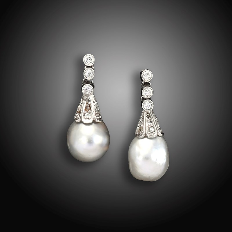 A pair of early 20th century natural pearl and diamond drop earrings, the natural pearls with diamond-set caps, suspending from an articulated line of circular-cut diamonds in white gold, post fittings, 2.5cm high