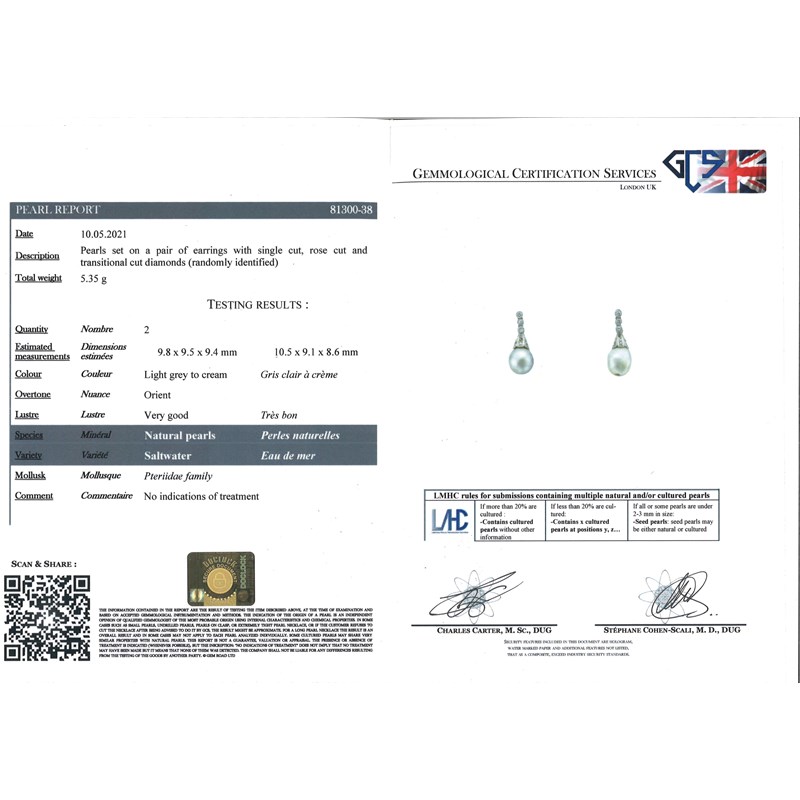 Accompanied by report number 81300-38 dated 10 May 2021 stating that the light grey to cream pearls measure 9.5 x 9.8 x 9.4mm and 10.5 x 9.1 x 8.6mm and are natural saltwater with no indications of treatment.