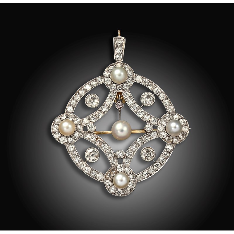 An early 20th century diamond and natural pearl-set brooch pendant, the four outer pearls each millegrain-set within a surround of circular-cut diamonds and suspending a further pearl with four diamonds to the inner diamond lattice, set in platinum and gold, detachable brooch fitting and pendant loop, 4cm wide