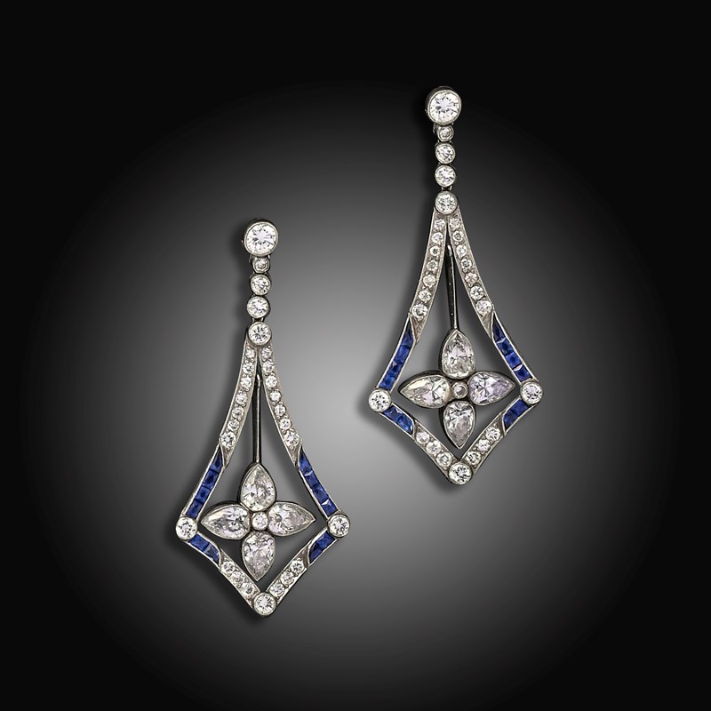 A pair of early 20th century sapphire and diamond drop earrings, each centre quatrefoil formed with four pear-shaped diamonds and centred with a smaller circular-cut diamond, suspending from a frame of small circular-cut diamonds and calibré-cut sapphires, surmounted with a line of five graduated brilliant-cut diamonds in platinum, 5cm high