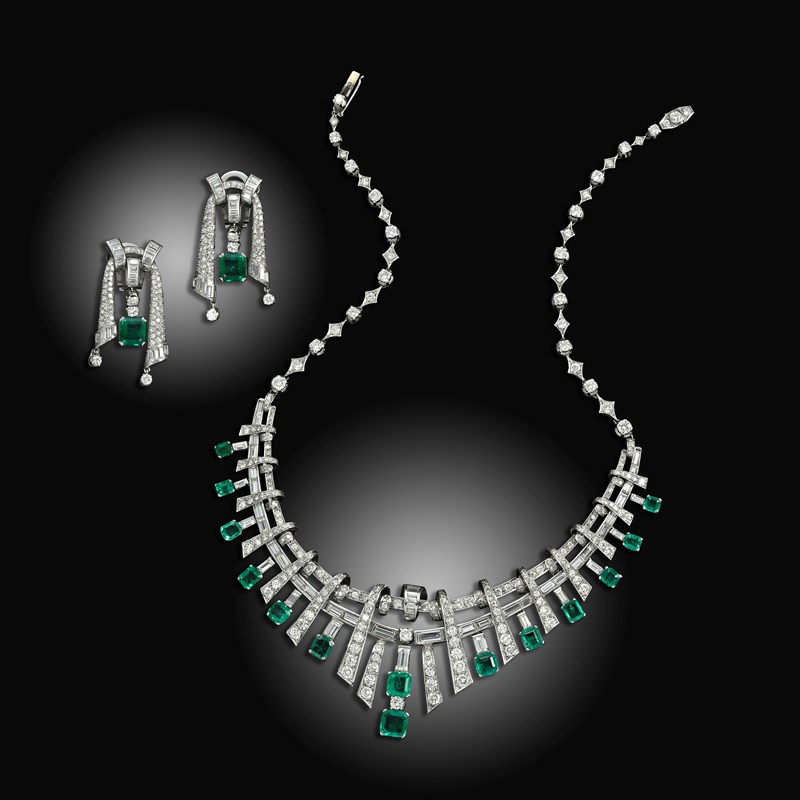 An emerald and diamond necklace and a pair of emerald and diamond earrings, c.1950, the articulated and graduated fringe necklace formed with two rows of graduated baguette-shaped and circular-cut diamonds, with graduated fringe of diamond-set stylised-cut ribbons, a lower border of fourteen square-shaped emeralds, diamond-set back chain, 40.5cm, platinum mount, 84g total, with a pair of diamond and emerald drop earrings, each emerald suspends from an articulated line of circular and baguette-shaped diamonds with a stylised fabric frame pavé-set with small diamonds in platinum, later added white gold clip fittings signed 'Pederzani', 4cm, damaged case