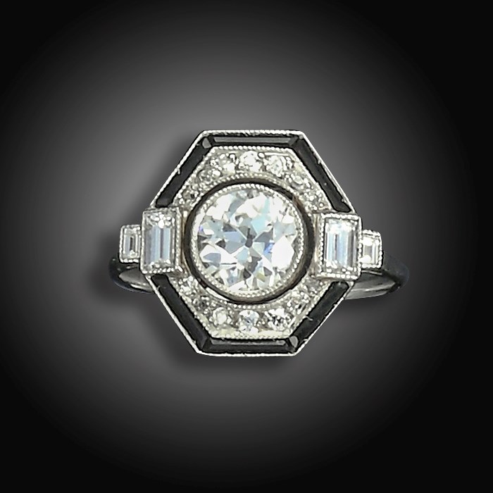 A diamond and onyx-set ring, centred with an old round brilliant-cut diamond, within a hexagonal surround set with old circular-cut diamonds and calibré-cut onyx, with baguette-shaped diamonds to the shoulders in platinum, size N 1/2