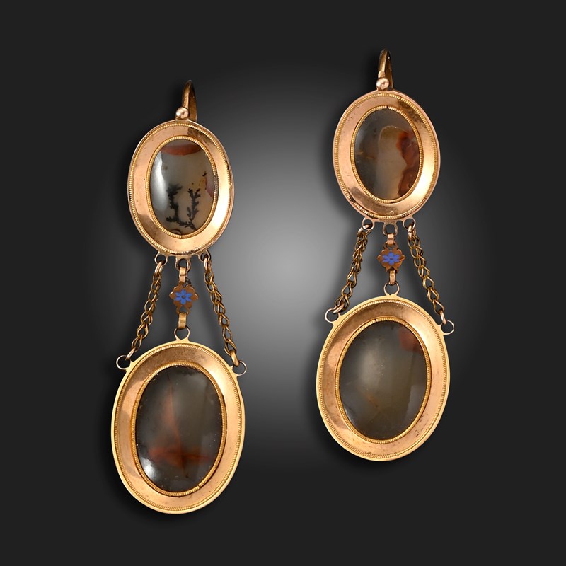 A pair of early 19th century French moss agate earrings, the two graduated oval moss agate panels in gold borders, separated with articulated gold chains, with a blue enamel forget-me-not, French marks, 5cm high