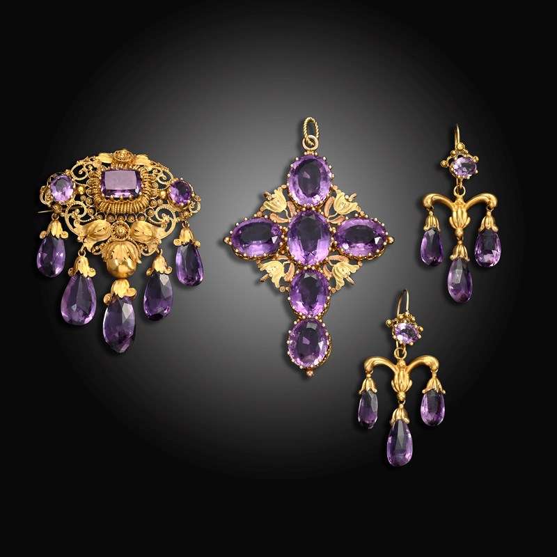 A 19th century suite of amethyst and gold jewellery, the gold filigree brooch pendant is mounted with three amethysts and with five pear-shaped drop amethysts, the cruciform pendant set with six oval-shaped amethysts and quartered with two colour gold textured flower designs, and a pair of girandole drop earrings, brooch 5.6cm, pendant 7.7cm including bale, earrings 5cm including bales, fitted case