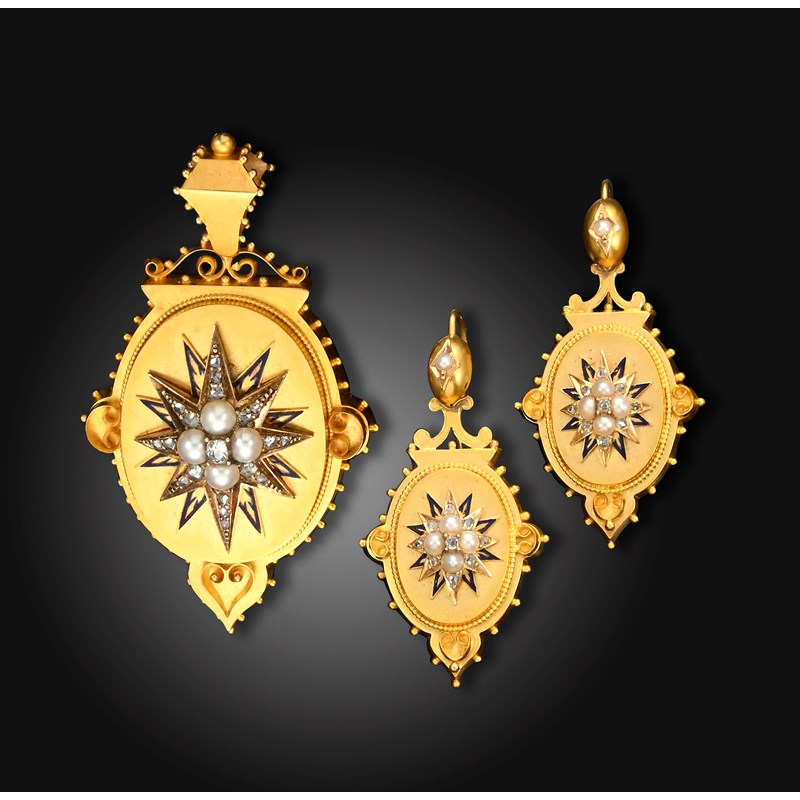 A Victorian demi parure, the gold pendant of oval-form with pellet and fine twisted wire scroll decoration, centred with a diamond and half-pearl star in gold, with conforming diamond, pearl and enamel gold earrings, fitted case by Everington, pendant 6.5cm high