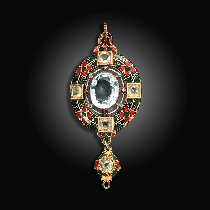 A mid Victorian Holbeinesque enamel and gem-set gold pendant