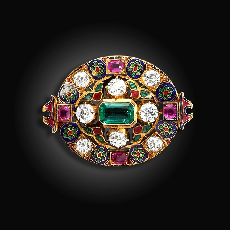 A Victorian gem-set Holbeinesque brooch pendant, decoration overall with polychrome enamel, centred with an emerald-cut emerald, set with four cushion-shaped rubies, eight old circular-cut diamonds in gold, 4.2cm wide