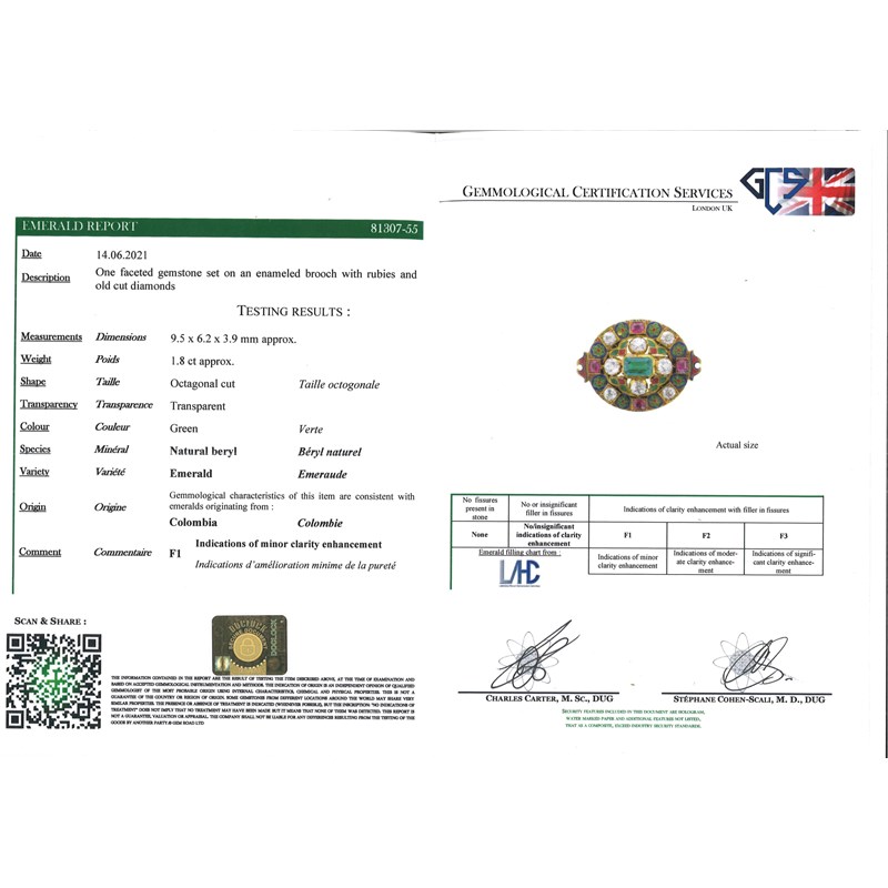 Accompanied by report number 81307-55 from GCS stating that the emerald is a natural emerald, with indications of minor clarity enhancement. Origin: Colombia
