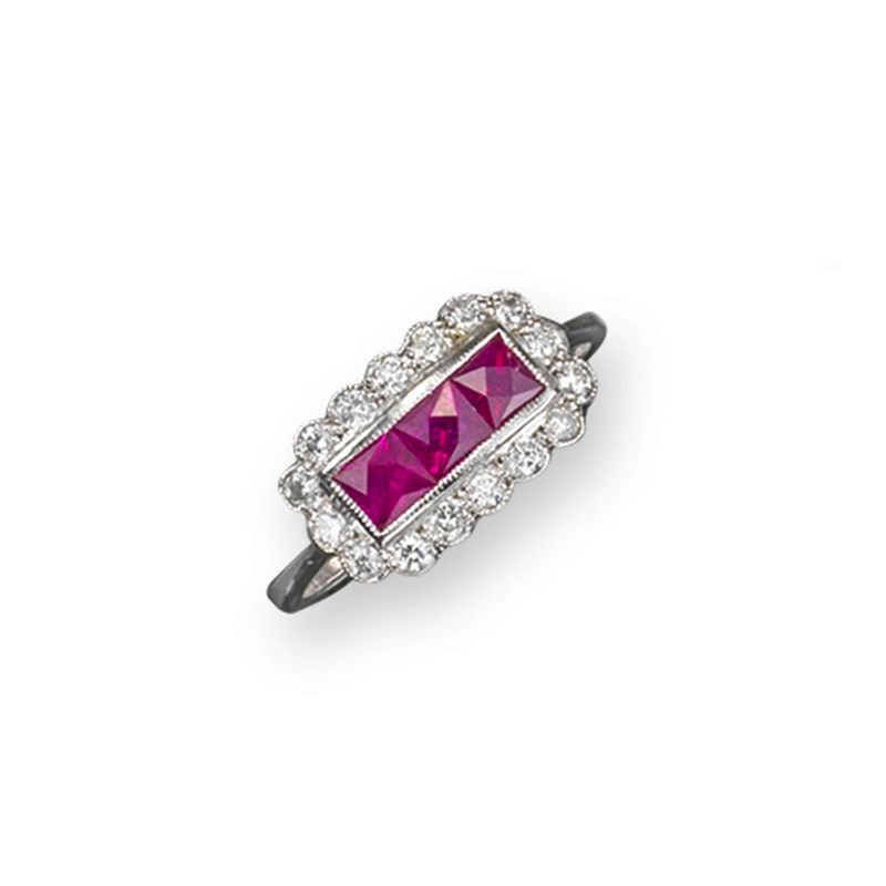A ruby and diamond set 18ct gold ring, millegrain set with three square-shaped rubies within a border of round brilliant-cut diamonds in white gold. Size O.