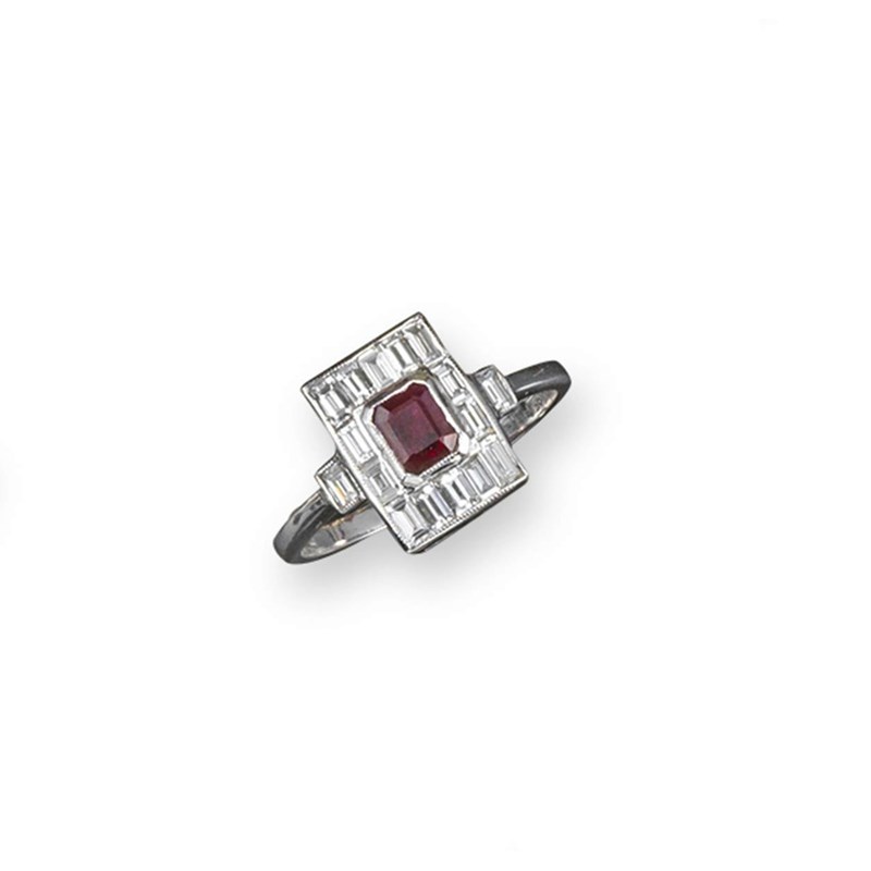 A ruby and diamond plaque ring, the emerald-cut ruby is set within a surround of baguette-shaped diamonds in white gold. Size O.