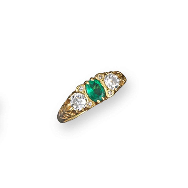 An emerald and diamond-set three stone ring, the oval-shaped emerald is set with two circular-cut diamonds in yellow gold. With four smaller diamonds. Size L 1/2.