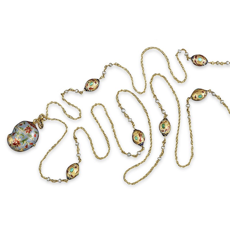An Indian gold longuard chain, the fine oval links are spaced with seven ovoid gold mounts and with enamel decoration and with four seed pearls, suspending an Islamic palm form gold locket pendant with enamel foliate decoration. 145cm. 49g in total