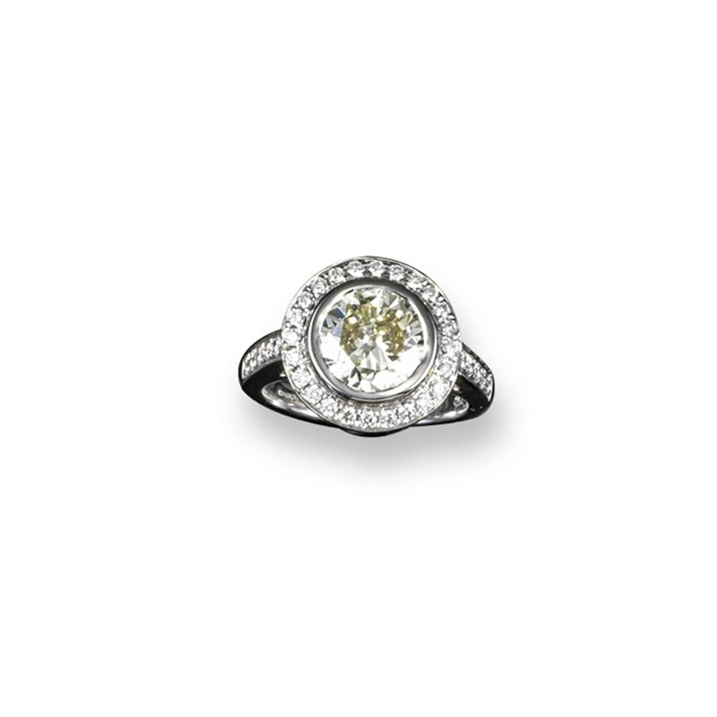 A diamond solitaire ring, the round brilliant-cut diamond weighs approximately 2.50cts and is set within a surround of smaller round brilliant-cut diamonds and with ten shoulder diamonds. 18ct white gold. Size M.